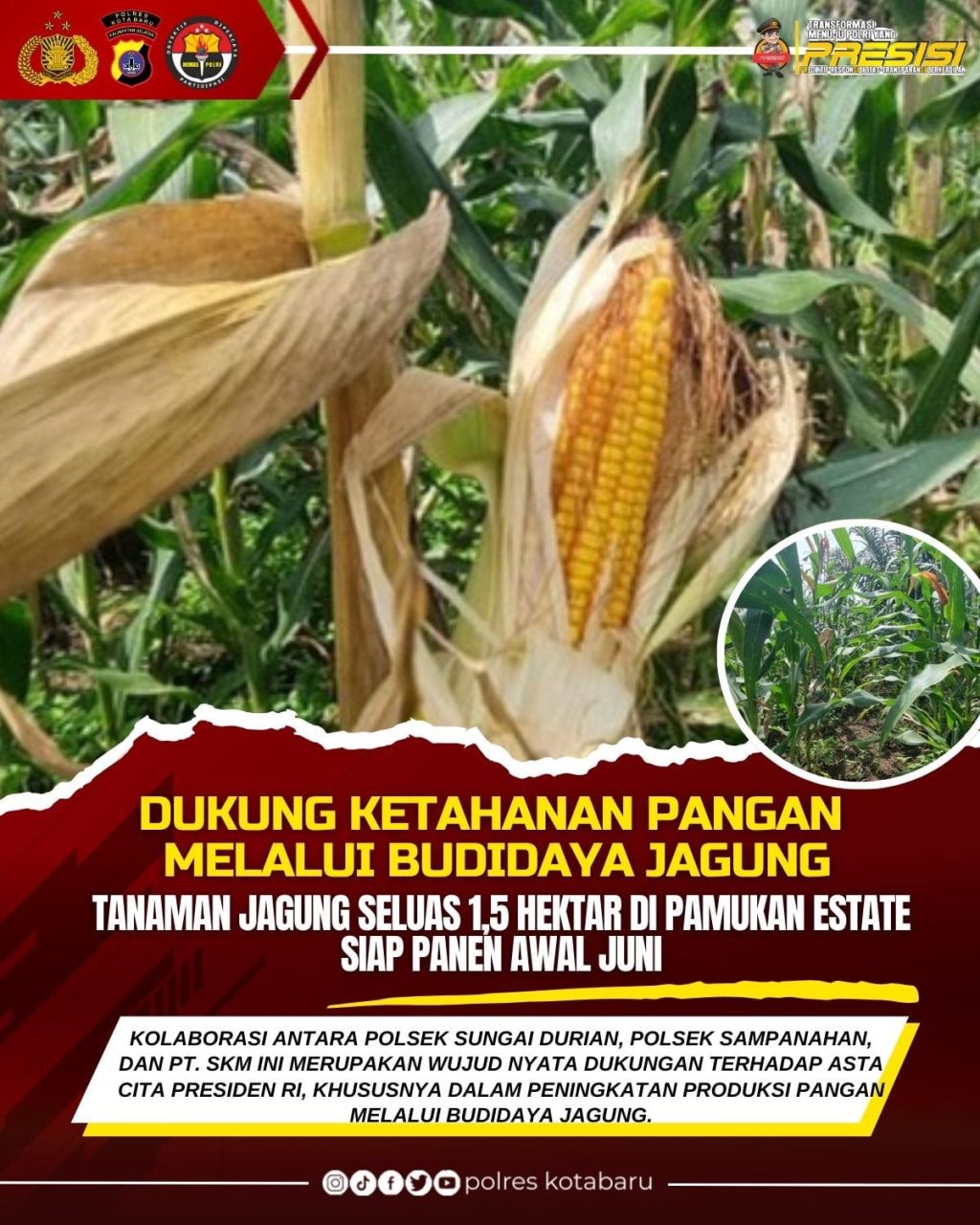 Kolaborasi antara Polsek Sungai Durian, Polsek Sampanahan, dan PT. SKM ini merupakan wujud nyata dukungan terhadap Asta Cita Presiden RI, khususnya dalam peningkatan produksi pangan melalui budidaya jagung. Saat ini, total lahan yang dikelola mencapai 50 hektar, dengan 26 hektar sudah terbuka, 14 hektar telah ditanami jagung, dan 1,5 hektar di antaranya akan segera dipanen.