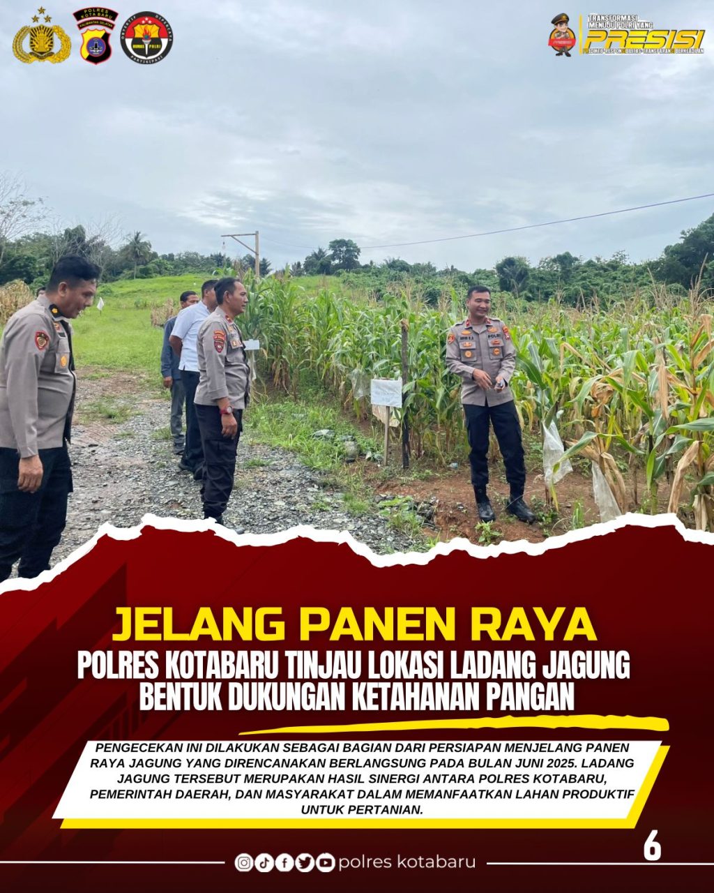 Pengecekan ini dilakukan sebagai bagian dari persiapan menjelang Panen Raya Jagung yang direncanakan berlangsung pada bulan Juni 2025. Ladang jagung tersebut merupakan hasil sinergi antara Polres Kotabaru, pemerintah daerah, dan masyarakat dalam memanfaatkan lahan produktif untuk pertanian.