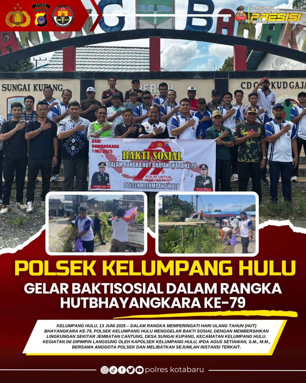 Polres Kotabaru Polda Kalsel _Dalam rangka memperingati Hari Ulang Tahun (HUT) Bhayangkara ke-79, Polsek Kelumpang Hulu menggelar bakti sosial dengan membersihkan lingkungan sekitar Jembatan Cantung, Desa Sungai Kupang, Kecamatan Kelumpang Hulu. Kegiatan ini dipimpin langsung oleh Kapolsek Kelumpang Hulu, IPDA Agus Setiawan, S.M., M.M., bersama anggota Polsek dan melibatkan sejumlah instansi terkait.