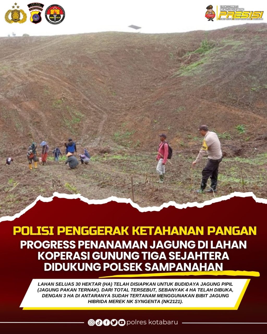 Progress Penanaman Jagung di Lahan Koperasi Gunung Tiga Sejahtera Didukung Polsek Sampanahan