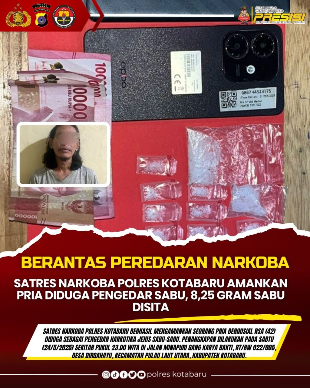 Polres Kotabaru Polda KalselĀ Satuan Reserse Narkoba (Satres Narkoba) Polres Kotabaru berhasil mengamankan seorang pria berinisial RSA (42) diduga sebagai pengedar narkotika jenis sabu-sabu. Penangkapan dilakukan pada Sabtu (24/5/2025) sekitar pukul 23.00 WITA di Jalan Minapuri Gang Karya Bakti, RT/RW 022/005, Desa Dirgahayu, Kecamatan Pulau Laut Utara, Kabupaten Kotabaru.